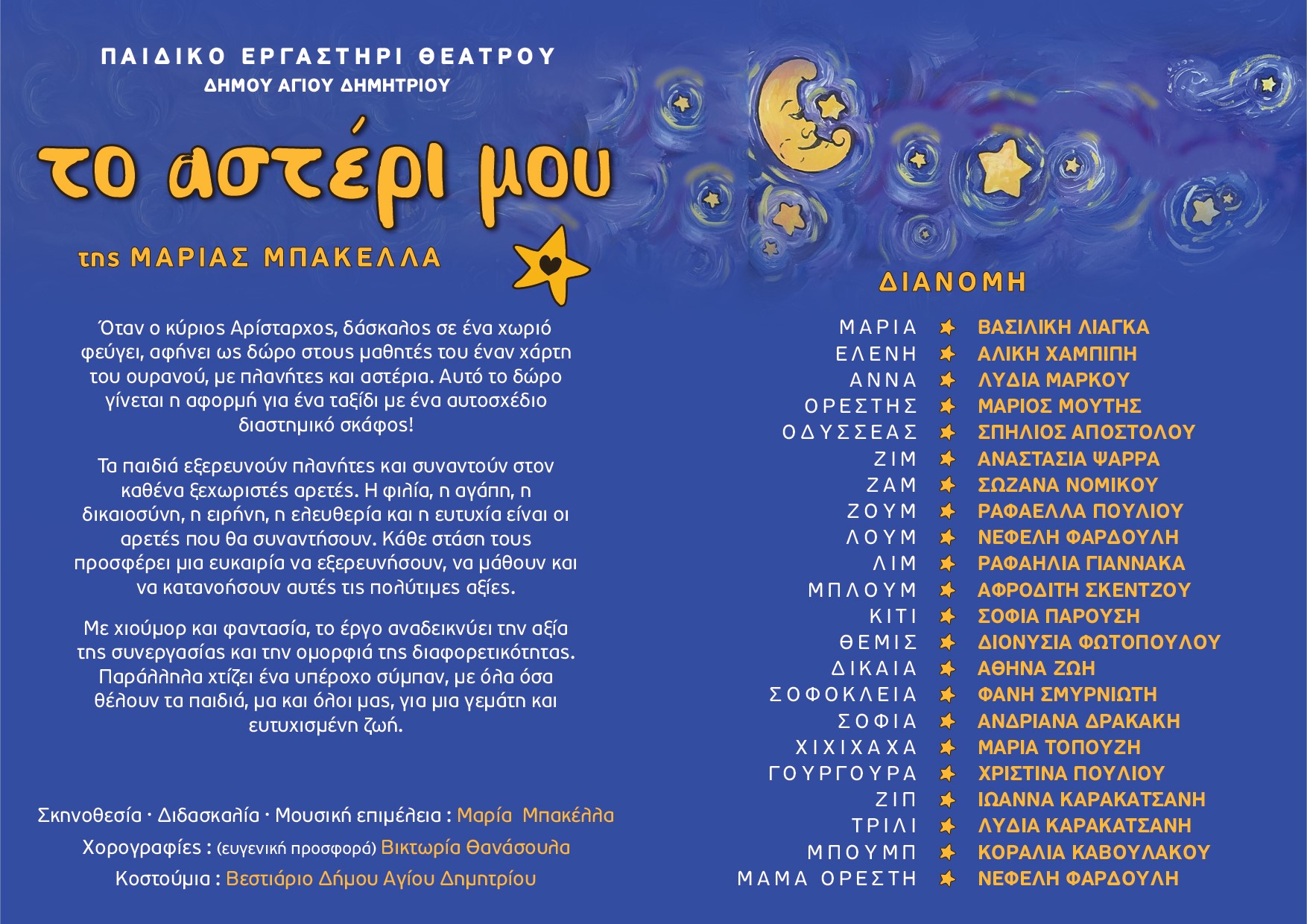 Θεατρικές ΟμάδεςΈνα μοναδικό και πρωτότυπο ταξίδι ξεκινάει την ερχόμενη Παρασκευή στο αμφιθέατρο του Στρογγυλού! Το Παιδικό Εργαστήρι Θεάτρου του Δήμου Αγίου Δημητρίου παρουσιάζει το έργο «Το Αστέρι Μου», μια διαδραστική παράσταση που φιλοδοξεί θα μαγέψει μικρούς και μεγάλους. Την παράσταση σε σκηνοθεσία, διδασκαλία και μουσική έχει επιμεληθεί η Μαρία Μπακέλλα. Οι χορογραφίες είναι της Βικτωρίας Θανάσουλα και τα κοστούμια από το βεστιάριο Δήμου Αγίου Δημητρίου.